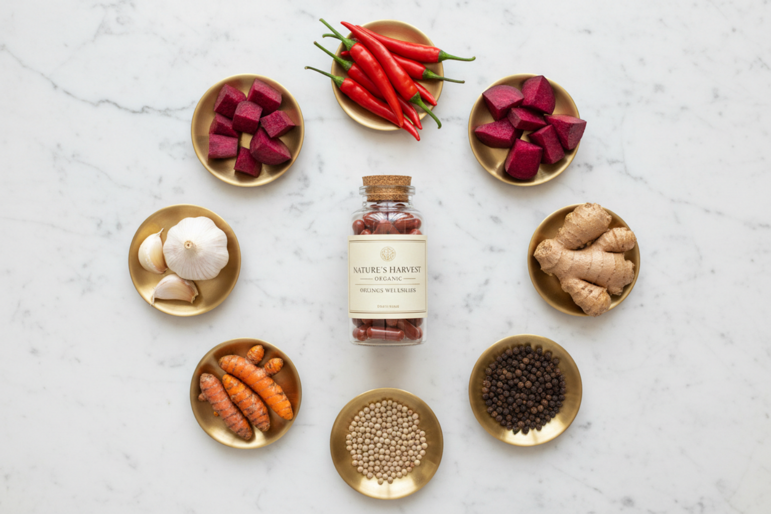This product contains a blend of organic cayenne extract alongside beetroot, ginger, garlic, turmeric, and black pepper.