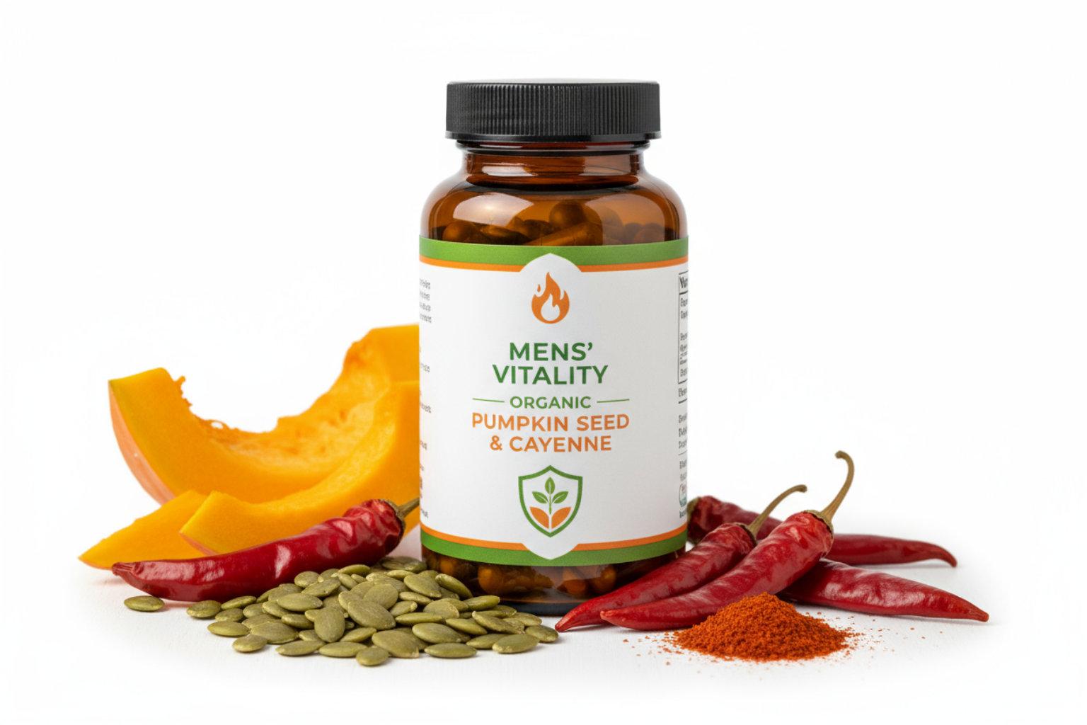 🔹 Ingredients: Organic Pumpkin Seed Powder, Organic Cayenne Pepper Powder, Plant-Based Capsule.